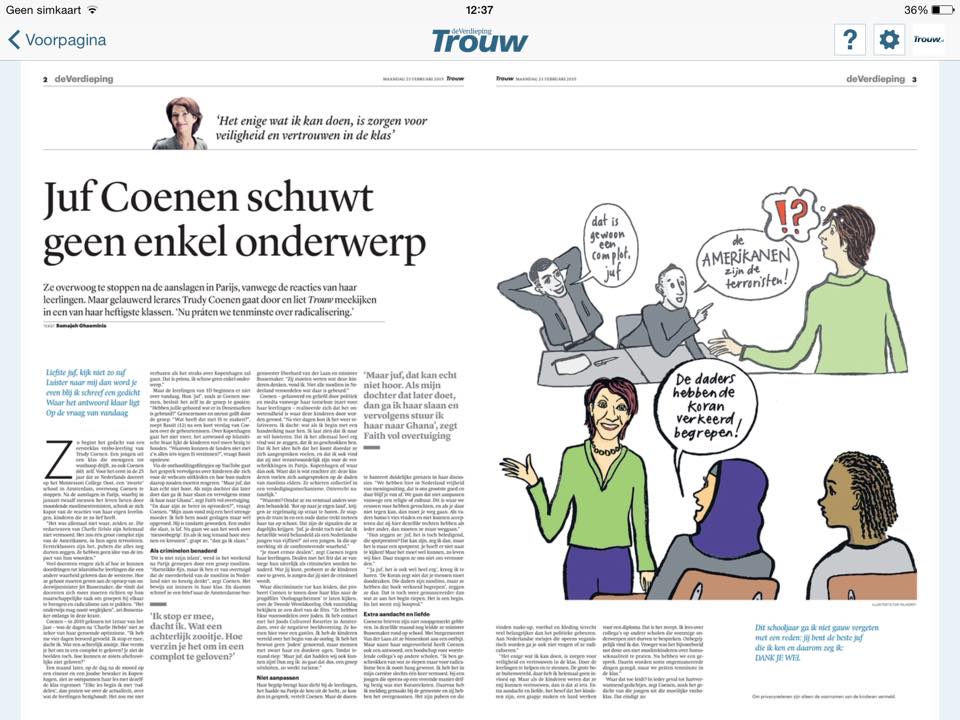 Juf Trudy Coenen die in 2011 leraar van het jaar werd, houdt in onderstaand artikel een warm pleidooi voor een echte relatie met je leerlingen. Die begint met het bieden van veiligheid en vertrouwen. Ze vertelt openhartig over haar eigen twijfels en zorgen na de aanslag op Charlie Hebdo, over de negatieve reacties van haar moslim VMBO-leerlingen. Haar motto: ‘Haal eruit wat erin zit’geeft ze nu ook weer handen en voeten in dit mooie artikel dat vandaag (23 februari) in Trouw stond.